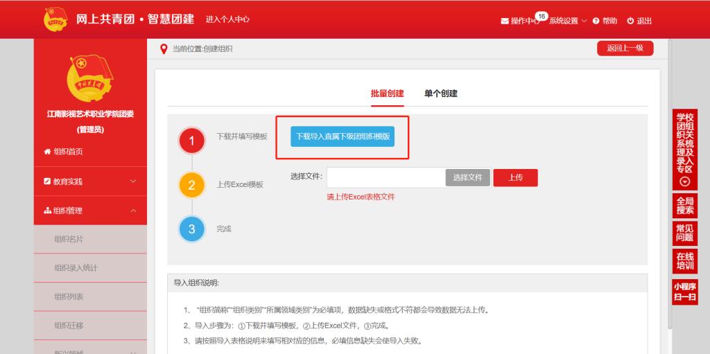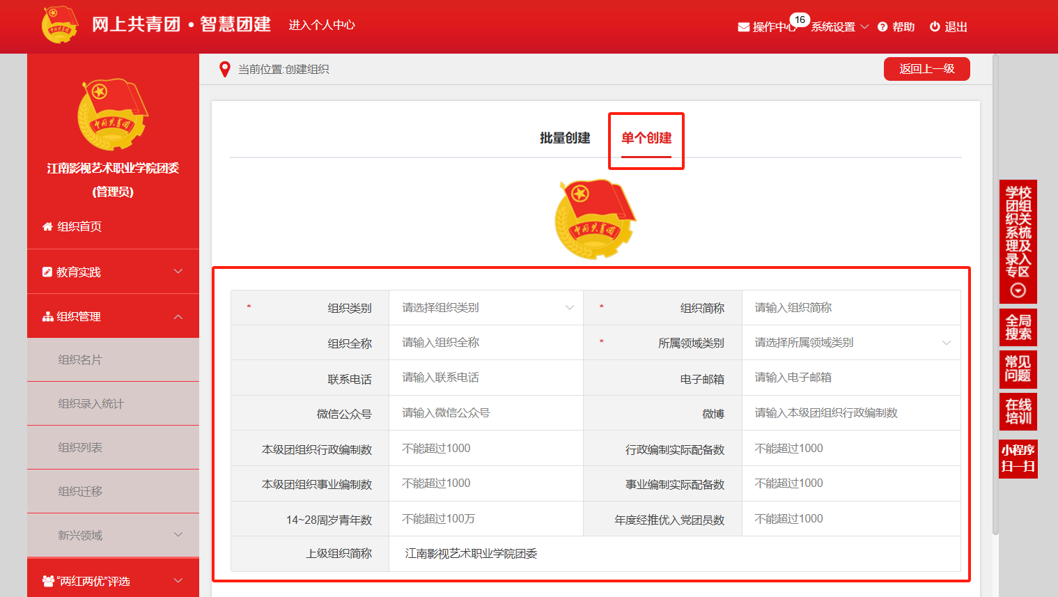 (4)点击 单个创建(建立202X级XXX班团支部)→提交