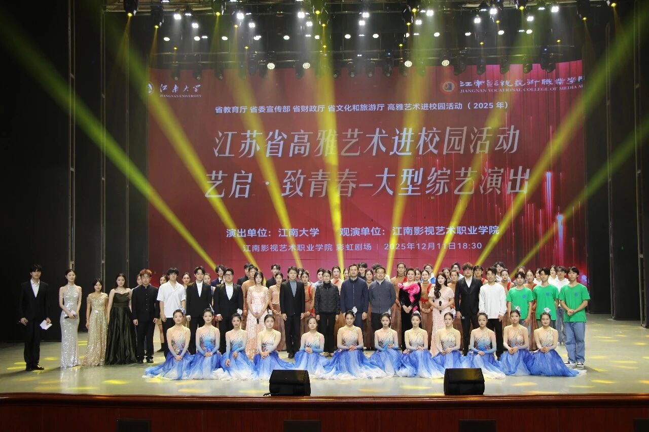 当舞台光影渐次亮起,青春的脉动与艺术的回响在此交叠。近日,在江南影视艺术职业学院彩虹剧院,一场名为“艺启·致青春”的大型综艺演出在这里温情上演。本次活动隶属江苏省教育厅、省委宣传部、省财政厅、省文化和旅游厅联合推动的“高雅艺术进校园(2025)”项目,江南大学以多元艺术形态为笔,绘就了一幅贯通传统意蕴与现代表达的校园美育画卷。